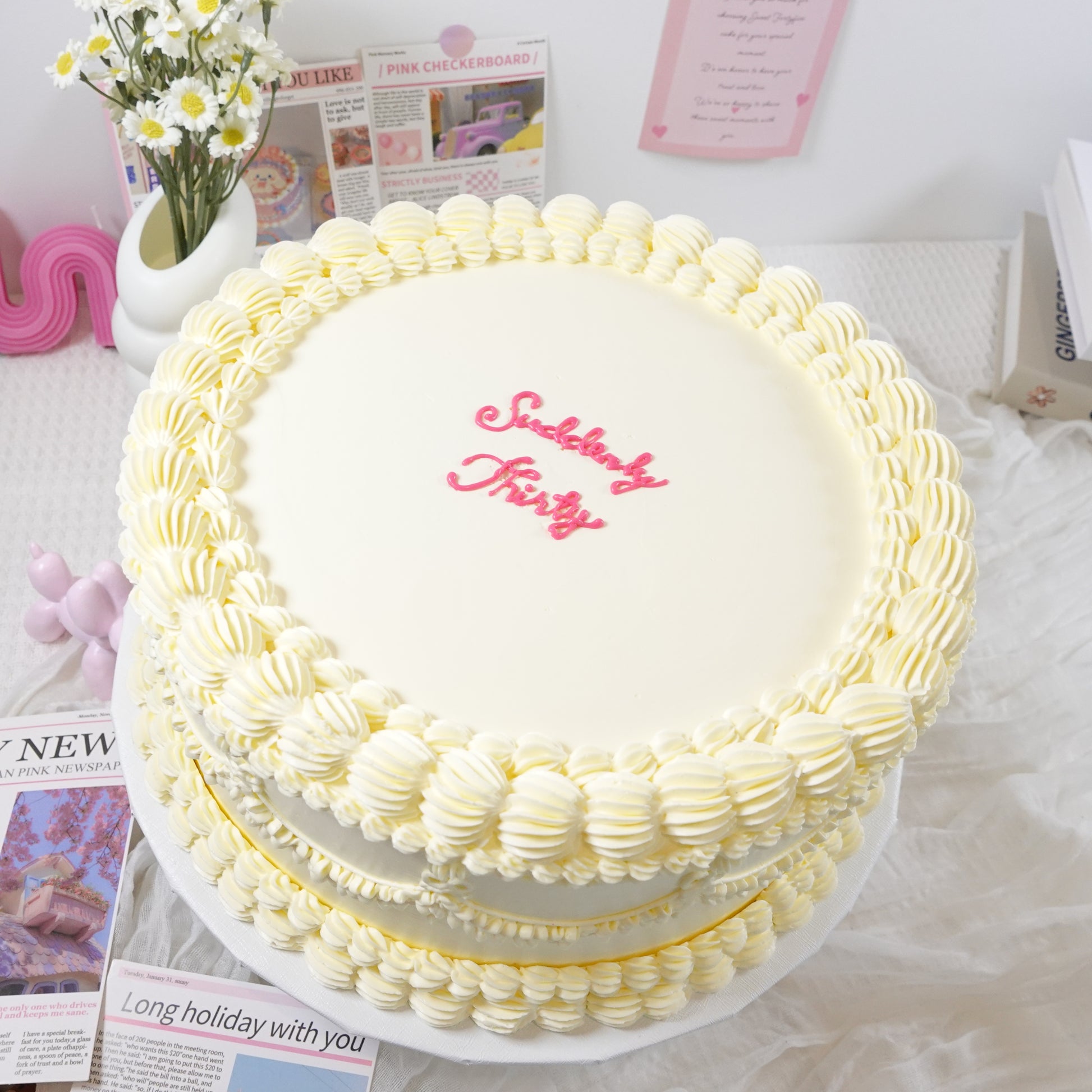 The Vintage Round Cake is a soft, moist pound cake delicately iced with smooth, unsweetened buttercream. Featuring simple yet intricate vintage-style piping, this cake blends classic charm with graceful beauty – making it a favourite for birthdays, anniversaries, and elegant gatherings across Canberra.